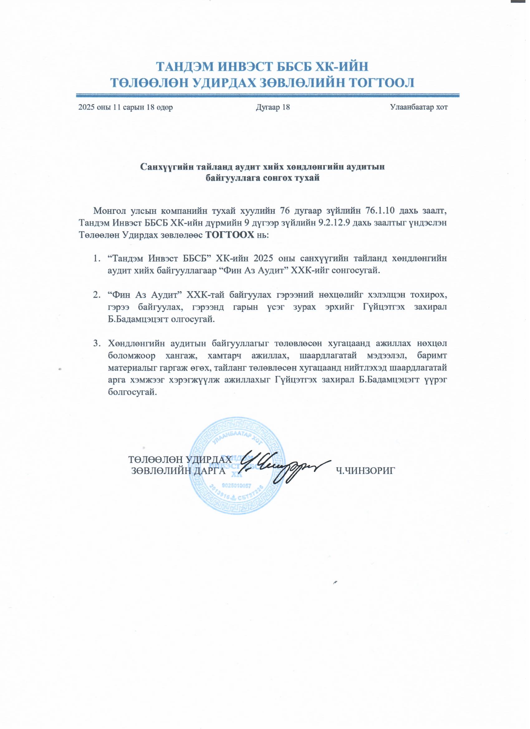 | 25 | Тандэм инвэст ББСБ ХК | TAND | ТУЗ-ийн хурлын шийдвэр | харах | 2025-11-06 |