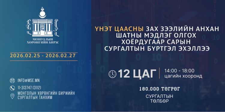 Монголын хөрөнгийн биржээс иргэдийн үнэт цаасны зах зээлийн мэдлэгийг дээшлүүлэх, хөрөнгө оруулалтын зөв шийдвэр гаргах чадварыг эзэмшүүлэх зорилгоор “Үнэт цаасны зах зээлийн анхан шатны мэдлэг олгох” шинэ оны анхны сургалтаа зарлаж байна. Сургалт Монголын Хөрөнгийн биржийн сургалтын танхимд 2026 оны 2 дугаар сарын 25-аас 27-ны хооронд явагдах бөгөөд санхүүгийн болон үнэт цаасны зах зээлд ажиллаж байгаа мэргэжлийн байгууллагын удирдлагууд, мэргэжилтнүүд сургалтыг удирдаж явуулна.
