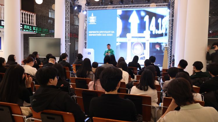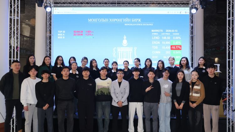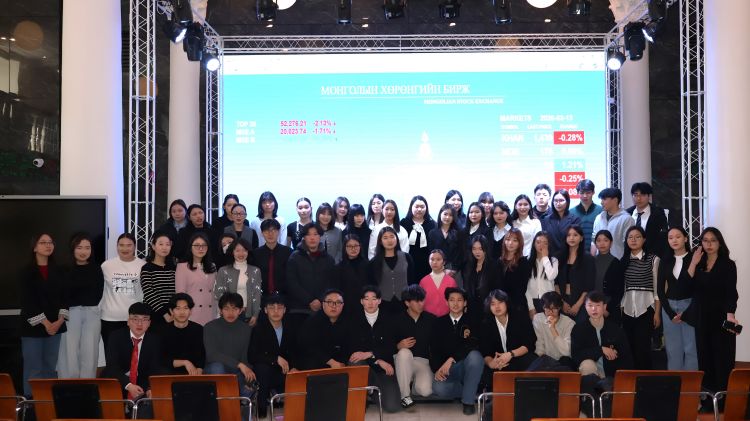 Тус сургуулийн Бизнесийн удирдлагын тэнхимийн Эдийн засгийн онолын ахлах багш Г.Гантөгс болон 1-р курсын 150 орчим оюутан залуус өнөөдөр (2026.03.13) Монголын хөрөнгийн биржид зочилж, Хөрөнгийн зах зээлийн талаарх онолын хичээлээ бататгах практик сургалт, холбогдох мэдээллүүдийг авлаа.