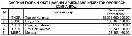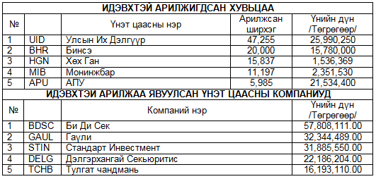 Нийт 46 компанийн 114,345 ширхэг хувьцааг 108,256,575.00 төгрөгөөр арилжсан.