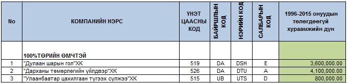 Нэр бүхий 100% төрийн өмчит 3 хувьцаат компани нь 2015 он ба түүнээс өмнөх оны өр төлбөрөө бүрэн барагдуулаагүй тул “Бүртгэлийн журам”-ын 25.4.2 дахь заалтын дагуу хувьцаат компаниудын нэрсийг олон нийтэд мэдээлж байна.