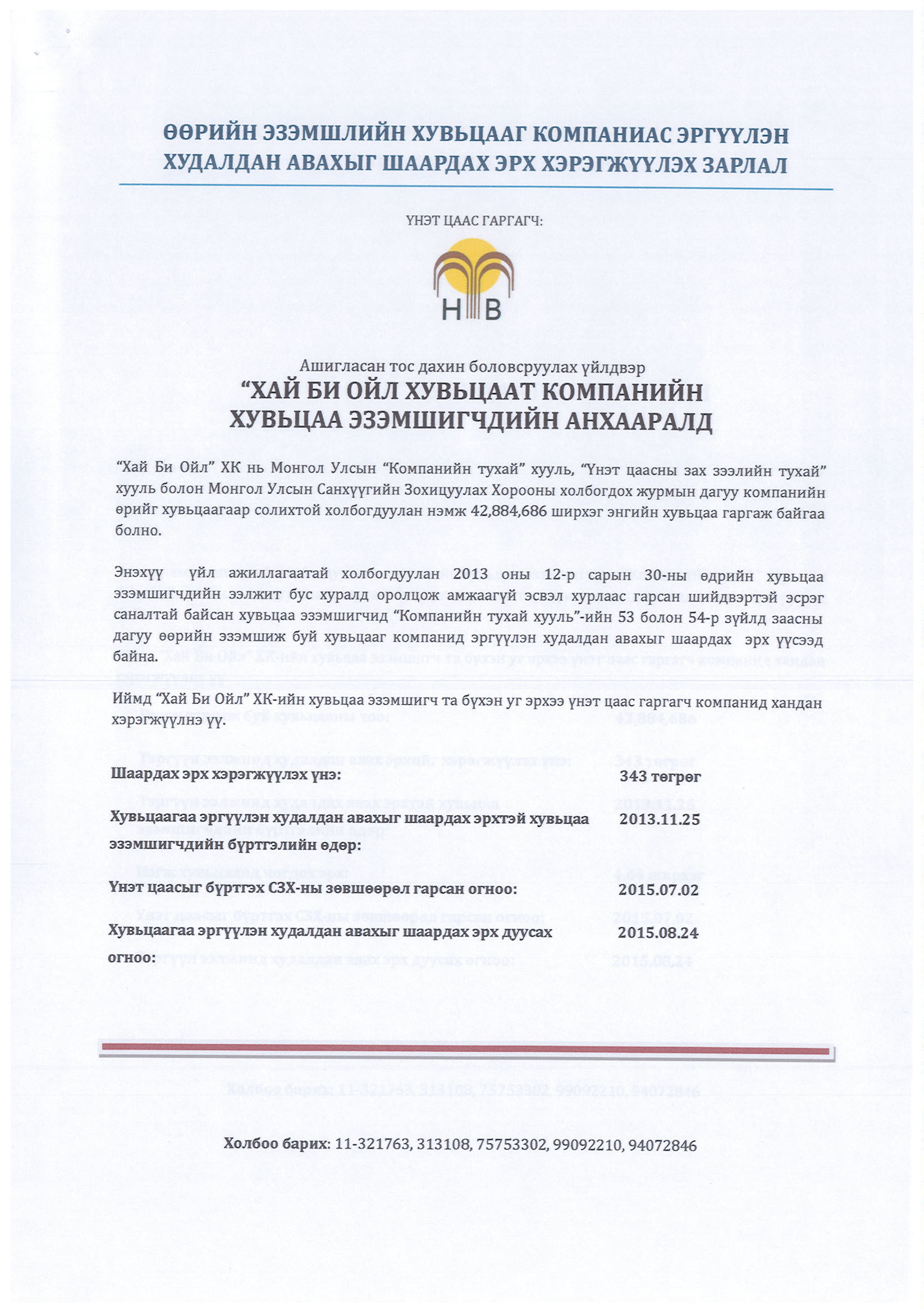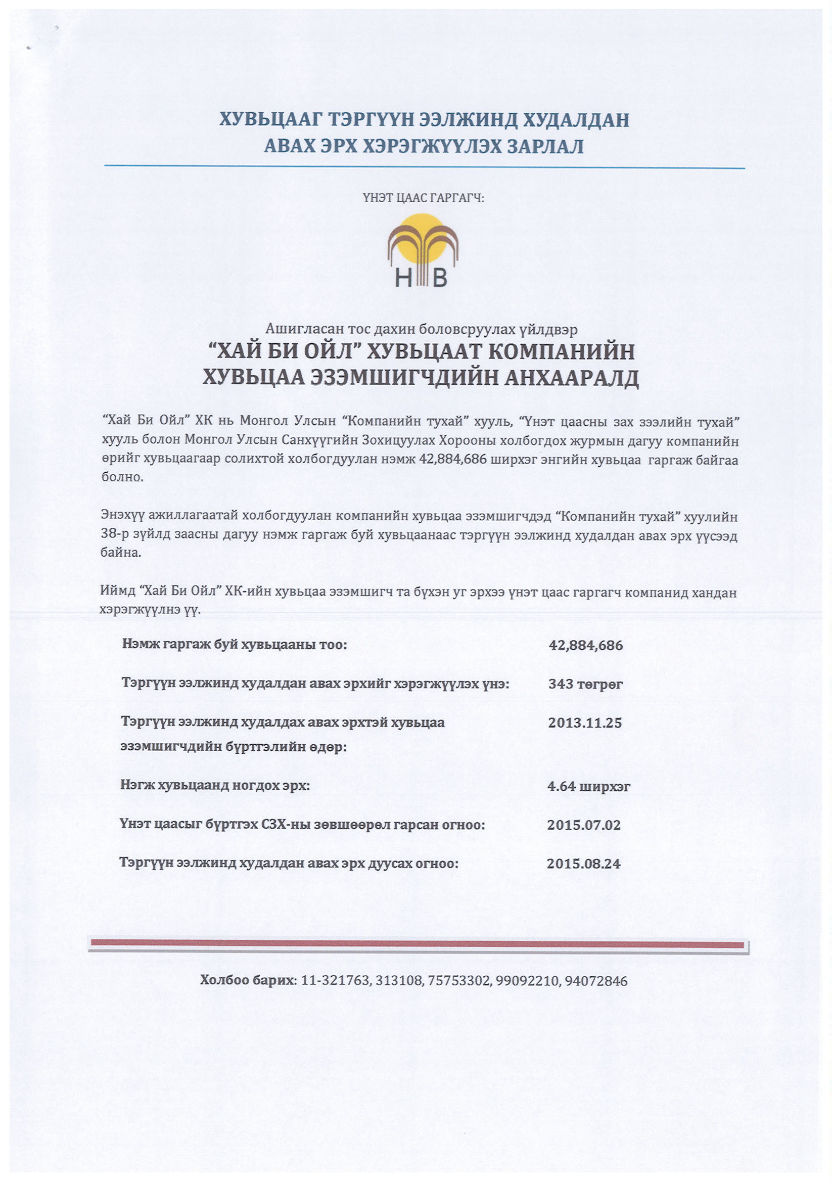 “ХАЙ БИ ОЙЛ” ХК-ИЙН ХУВЬЦАА ЭЗЭМШИГЧДИЙН АНХААРАЛД